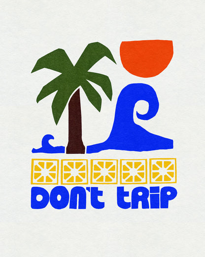 Keywords: beach wall art, surf art print, don't trip poster, Santa Cruz artwork, vintage motel sign design, coastal California decor, 70s graphic style, boho surf art, ocean wave illustration, palm tree print, bold colorful wall art, California summer vibes, gift for surfers, retro surf poster, laid-back typography art