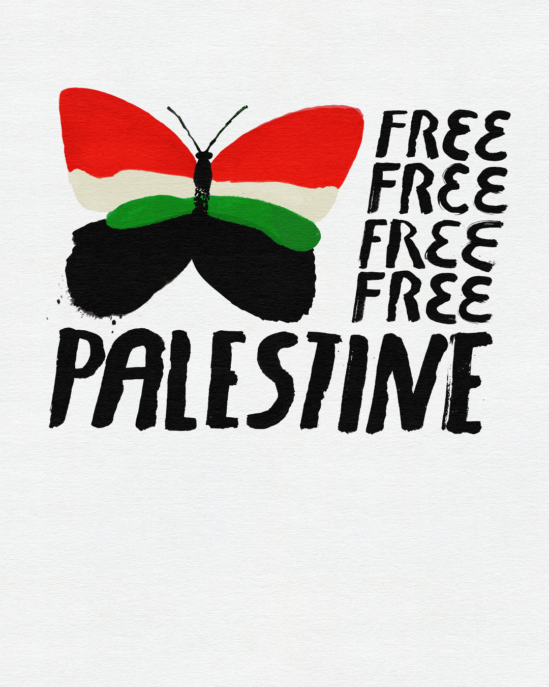 This powerful, hand-painted butterfly print features the colors of the Palestinian flag with bold text declaring: Free Free Free Free Palestine. It is more than a piece of art—it’s a call for justice and liberation. 100% of the profits from this print go directly to Methal’s GoFundMe, helping evacuate her and her family from Gaza to safety.