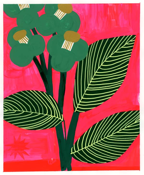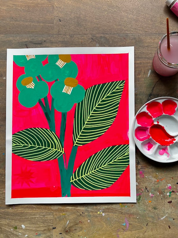 This is an original gouache painting on 2 ply Strathmore paper, it’s 14 X 17 inches. The background is hot pink and not red.