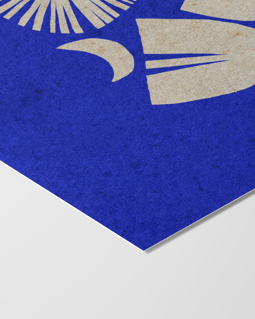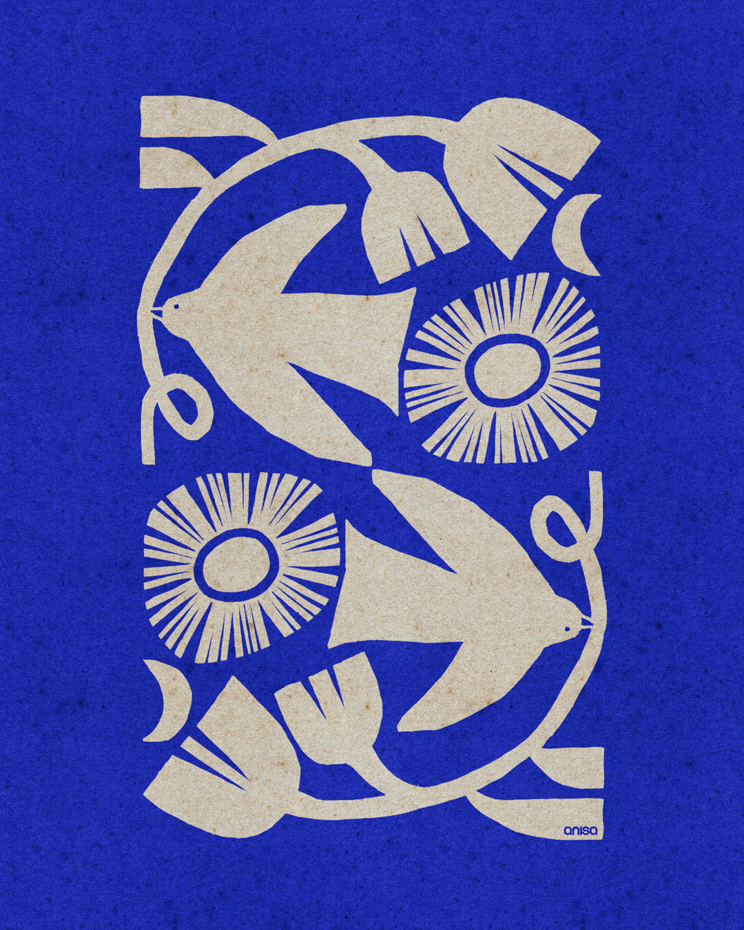 Printed in crisp cream against a vibrant cobalt blue background with a natural paper texture, this piece brings warmth, symbolism, and quiet magic to any space.