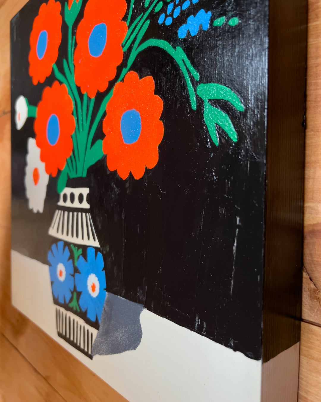 This vibrant still life blends folk-art boldness with a dramatic nighttime palette. Painted in rich acrylics on a ready-to-hang birch wood panel, this one-of-a-kind piece brings depth, contrast, and graphic charm into any room. Sealed with a gloss varnish for protection.
