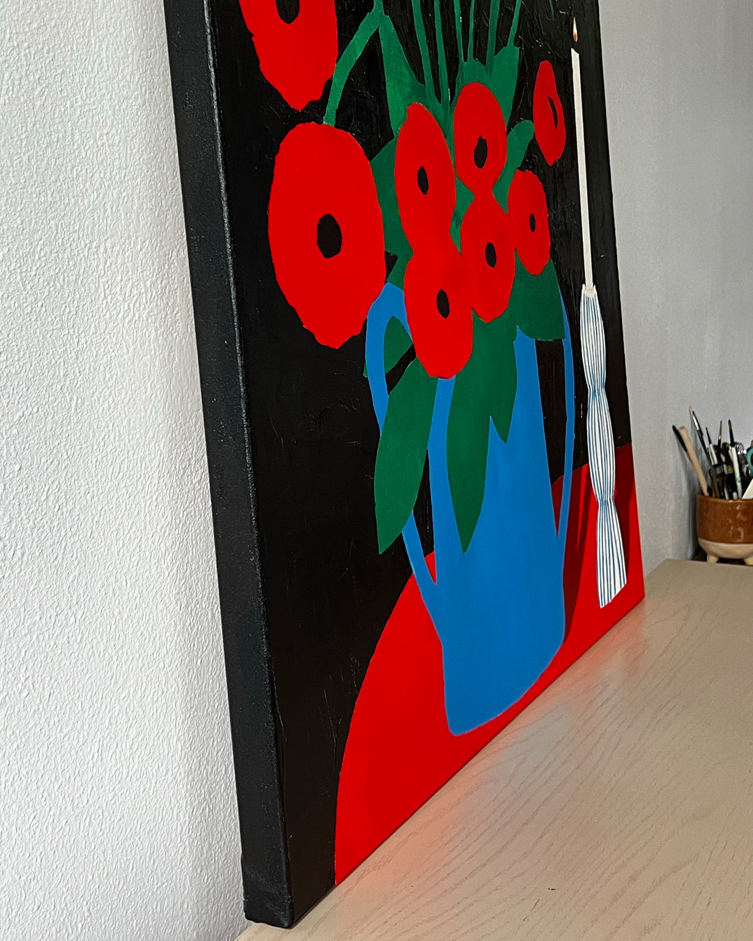 A dozen stylized red poppies command the canvas, their vibrant petals striking against the rich black background. Nearby, a single lit candle burns steadily—its flame quiet but unwavering, a silent companion to the flowers in the night.