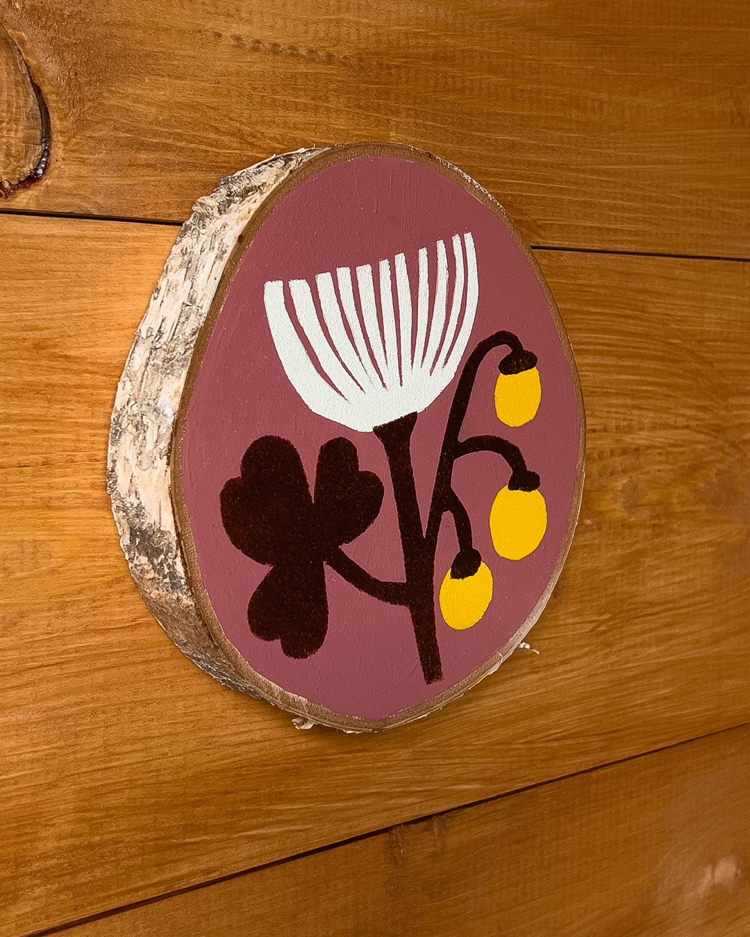 - Textured Surface: The acrylic paint sits over the subtle grain of the wood slice, giving the painting a tactile, handmade presence on the wall.