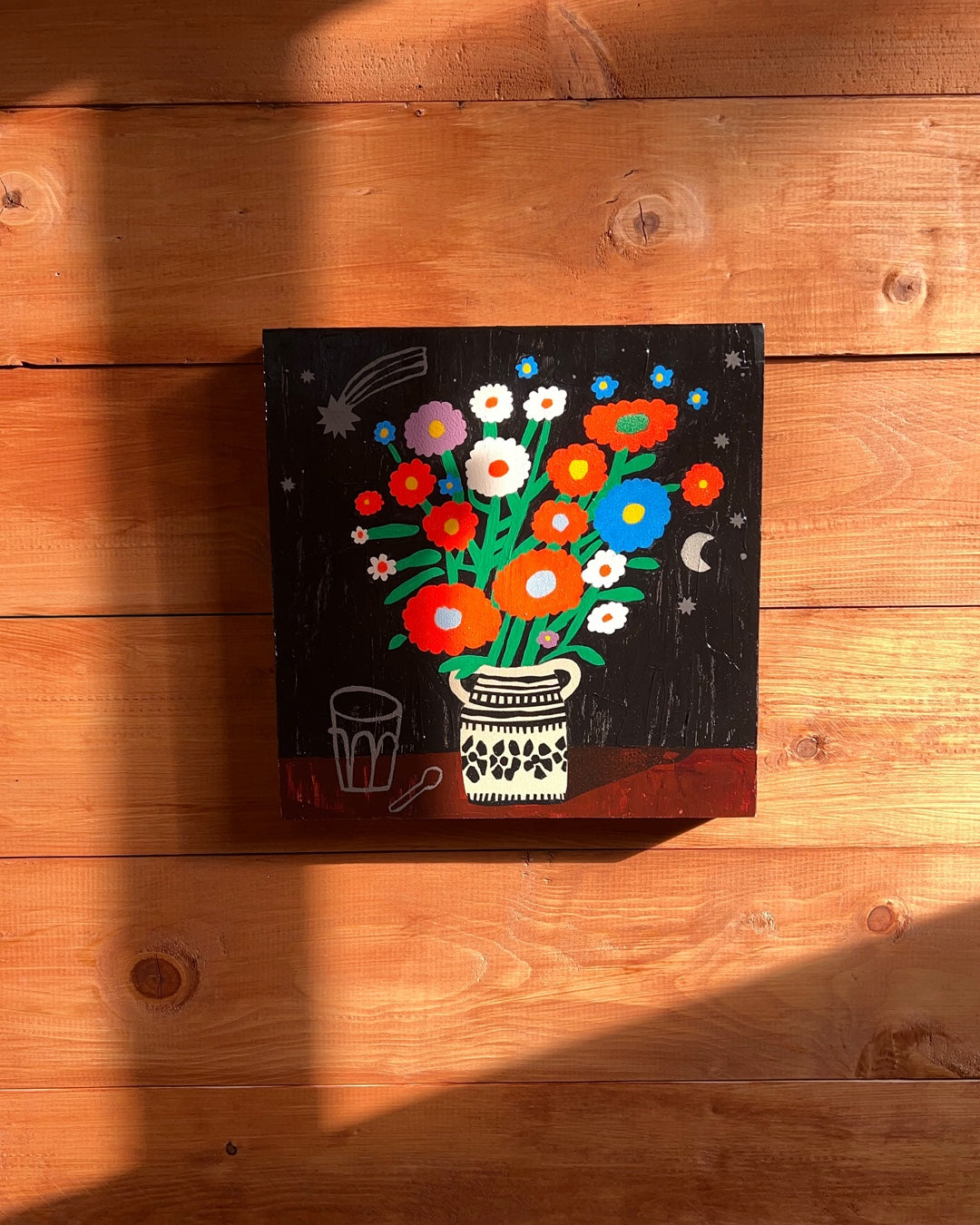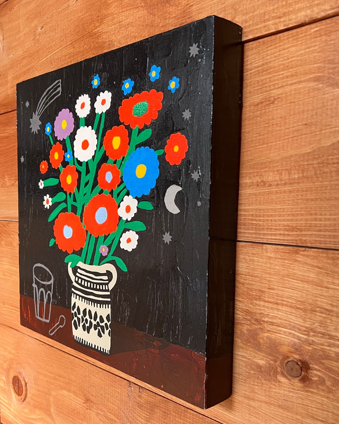 This vibrant still life blends folk-art florals with celestial symbolism—a bouquet glowing against a night sky filled with stars, a crescent moon, and a streaking comet. Painted in rich acrylics on a ready-to-hang birch wood panel, this one-of-a-kind piece brings magic, color, and graphic charm into any room. Sealed with a gloss varnish for protection.